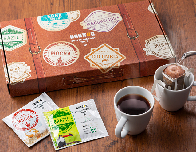 ドトールがお届けする、コーヒーの歴史とともに旅するドリップコーヒー。ギフトボックスは、コーヒーの旅にぴったりな鞄をイメージし、6か所を巡った証のパスポートスタンプをあしらいました。