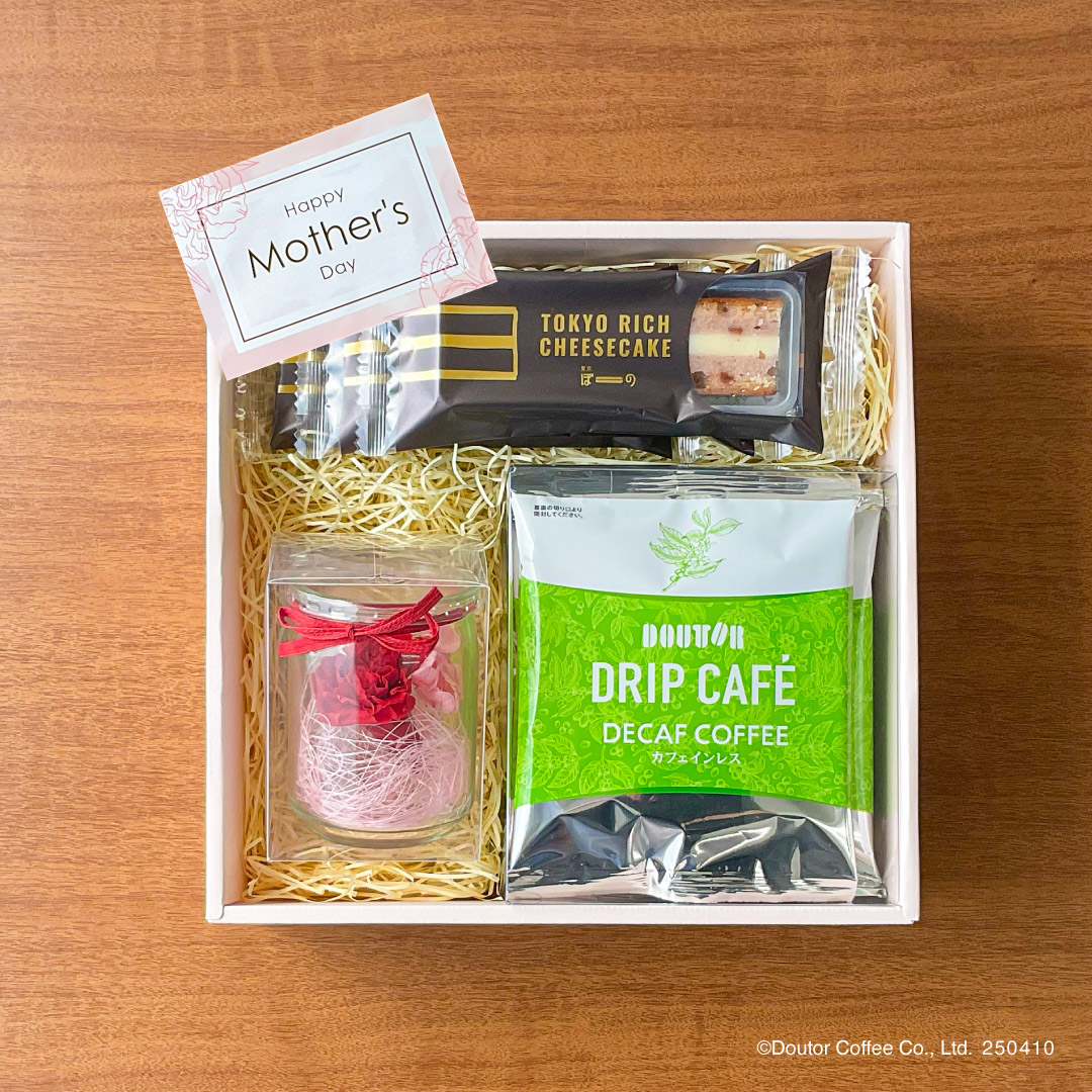ドトールコーヒーショップの一番人気「マイルドブレンド」のドリップカフェと、「東京ぼーの」の甘く香り立ついちごとまろやかなチーズの相性が抜群の「トーキョーリッチストロベリーチーズケーキ」、母の日に贈りたいドトールコーヒーオリジナルの「プリザーブドフラワー」または「ハンドタオル」をセットにしたオンラインショップ限定の「母の日ギフトセット」です。カフェインを気にされている方には、ドリップカフェを「カフェインレスコーヒー」に変更することもできます。お母様の好みに合わせて、選べるギフトをご用意いたしました。