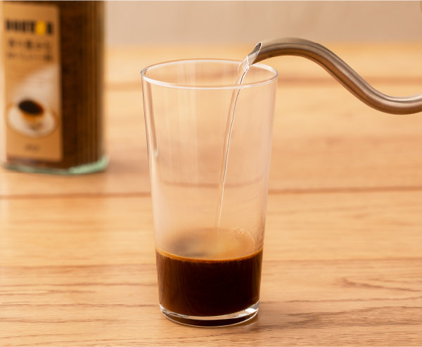 規定量のお湯(ホットの半分)を注ぎ、溶け残りがなくなるまでよくかき混ぜてください。 商品によってお湯の量は異なります。 火傷の恐れがありますので、熱湯の取扱いには十分ご注意ください。