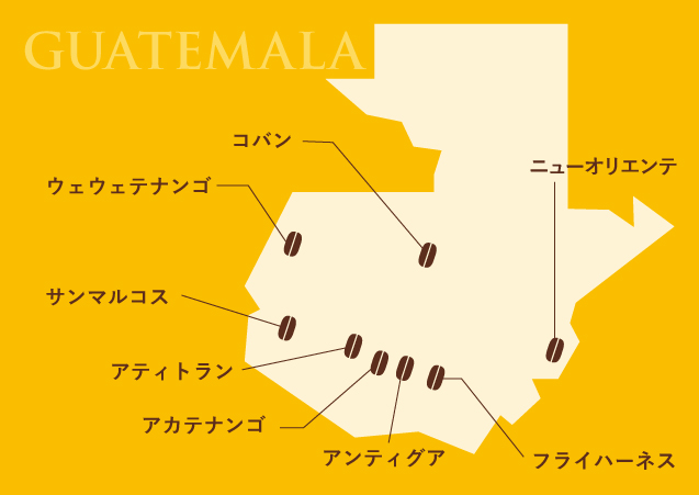 「アンティグア」「ウェウェテナンゴ」「サンマルコス」「アティトラン」「コバン」「フライハーネス」「ニューオリエンテ」「アカテナンゴ」 8エリアをコーヒー生産地域として認定しており、エリアごとに味わいの特長が異なります。