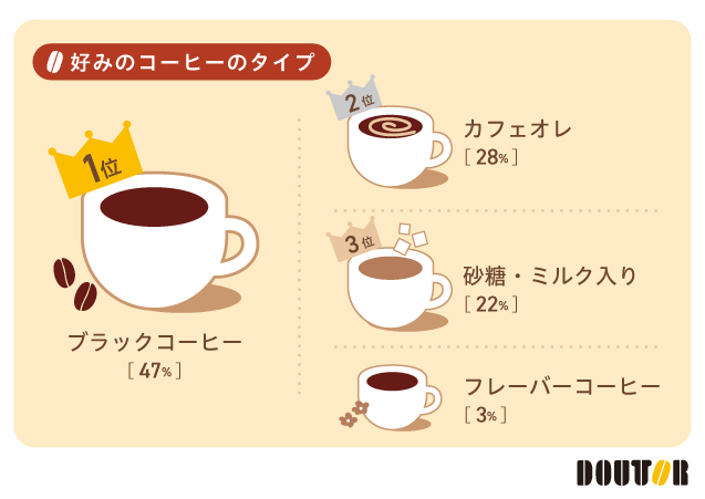 好みのコーヒーのタイプを聞いたところ、「ブラックコーヒー」が最も人気で、全体の47%を占めました。次いで「カフェオレ」が28%、「砂糖・ミルク入り」コーヒーが22%、「フレーバーコーヒー」が3%という結果に。