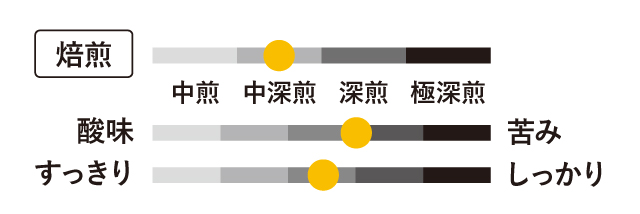 豆本来の甘味を炭火焙煎で引き出しました。やわらかな口当たりと、まろやかな味わい。ビスケットのような香ばしさと、コクのある甘味が口いっぱいに広がります。