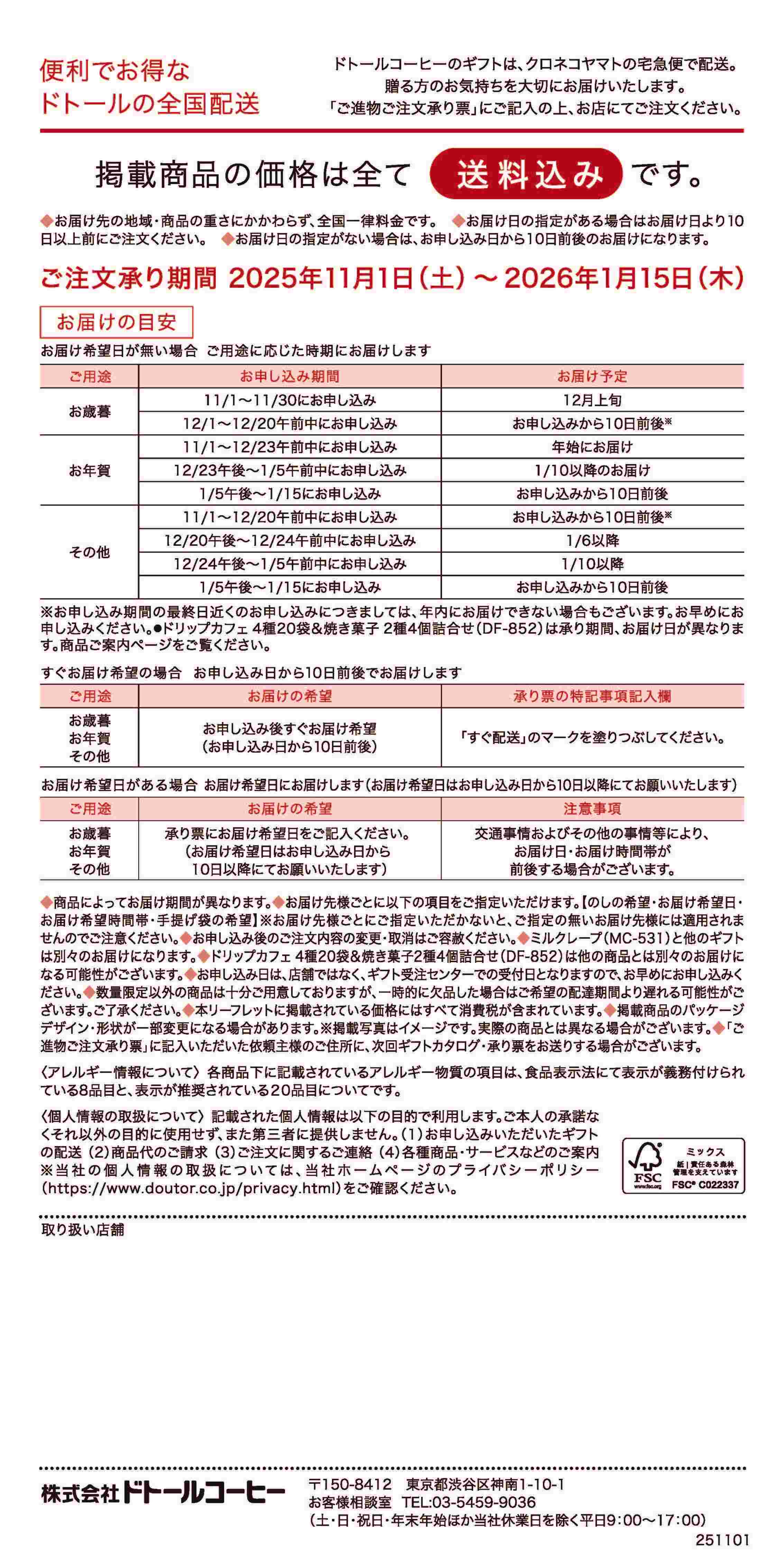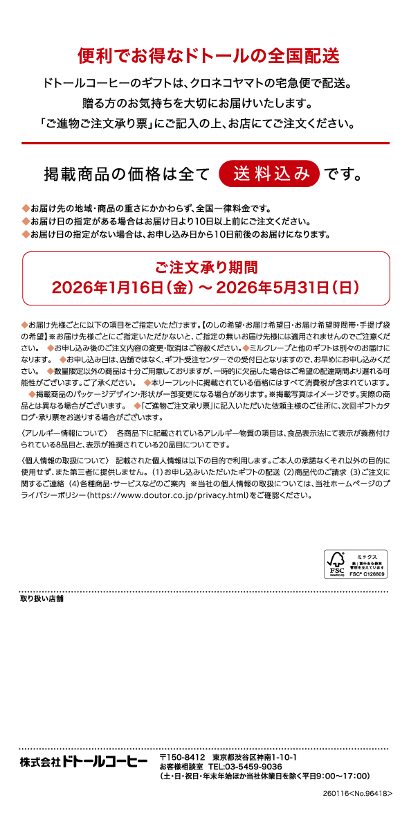 記載された個人情報は以下の目的で利用します。ご本人の承諾なくそれ以外の目的に使用せず、また第三者に提供しません。 (1)お申し込みいただいたギフトの配送 (2)商品代のご請求 (3)ご注文に関するご連絡 (4)各種商品・サービスなどのご案内 ※当社の個人情報の取扱については、当社ホームページのプライバシーポリシー(https://www.doutor.co.jp/privacy.html)をご確認ください。