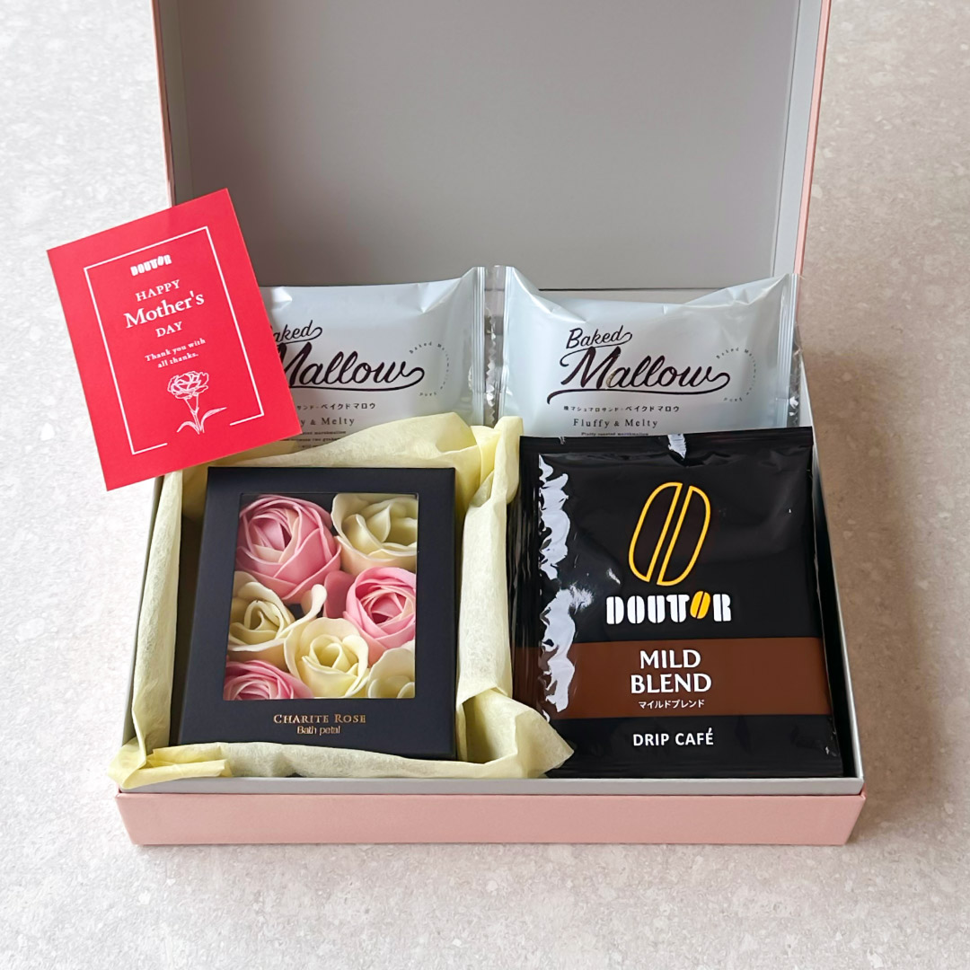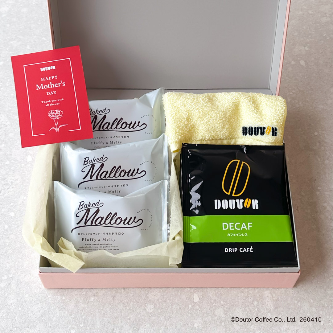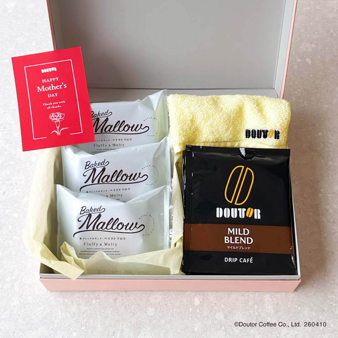 株式会社ドトールコーヒー(本社:東京都渋谷区/代表取締役社長:星野 正則)は、2026年4月10日より、公式通販サイト「ドトール オンラインショップ」にて、ほっとひとときを贈る「選べる母の日ギフト」の予約を開始いたします。ドリップカフェと人気のスイーツ、オリジナルハンドタオルやソープフラワーを詰め合わせた、母の日限定の特別なギフトです。贈る方の好みに合わせて組み合わせを選べる、心まであたたまる母の日ギフト。「ありがとう」と「ほっとする時間」を一緒に贈りませんか。